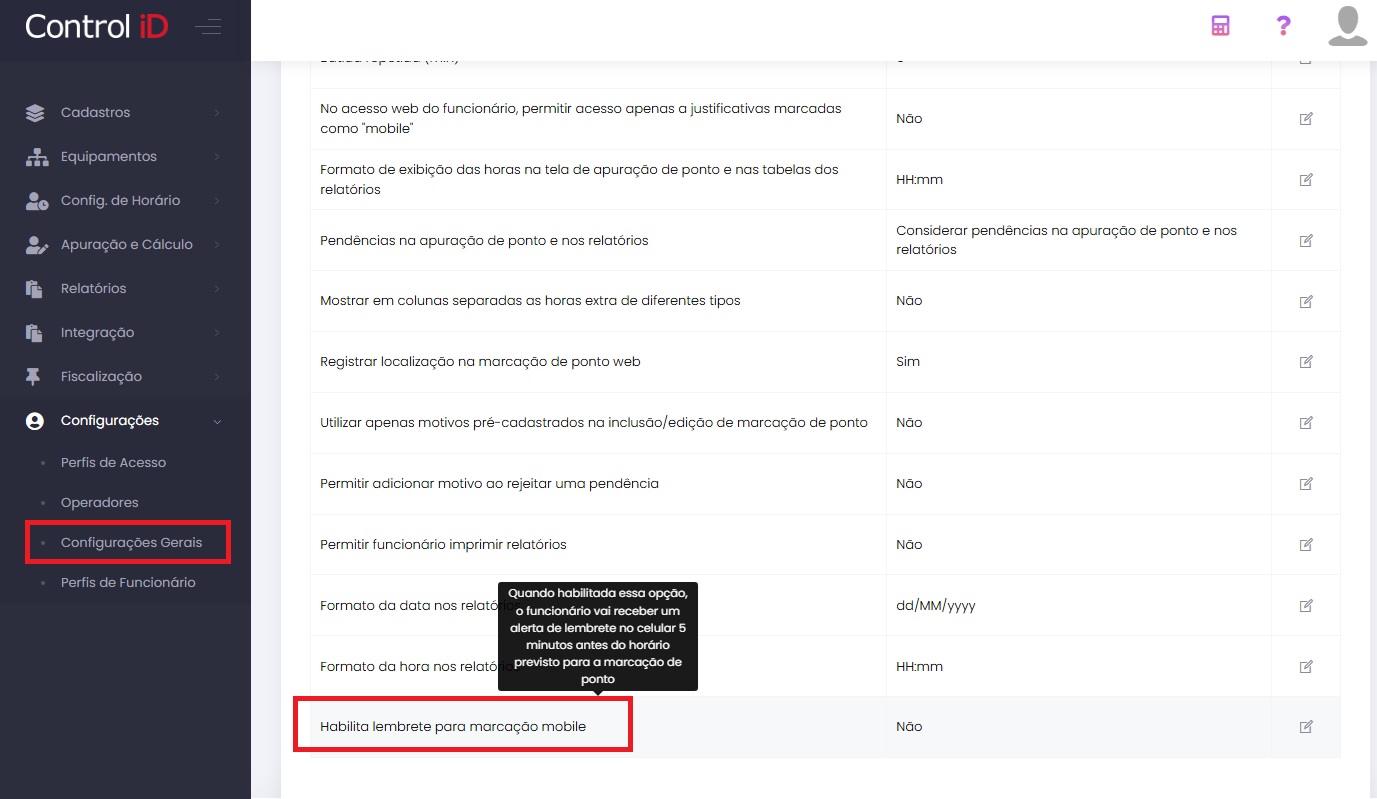 Esse lembrete deve ser habilitado nas configurações gerais e, quando habilitado, será efetivo para todos os funcionários que utilizam o App Mobile.